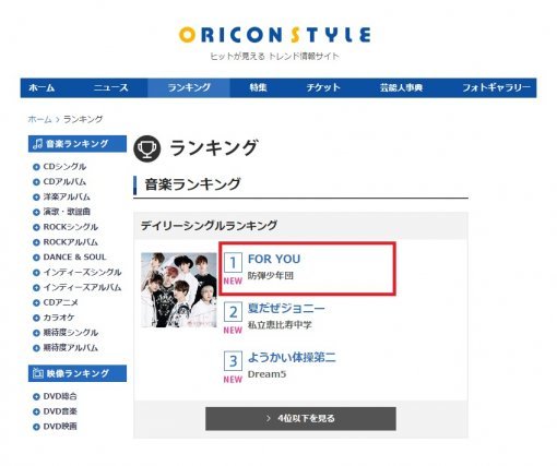 17일 발표된 오리콘 일간 싱글 차트에는 방탄소년단의 '포유(For you)가 1위에 랭크됐다.