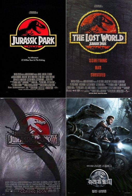 왼쪽부터 ‘쥬라기 공원’ 1편 2편 3편 그리고 ‘쥬라기 월드’ 포스터. 사진|IMDB