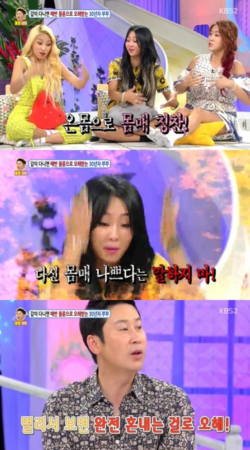소유는 “효린과 다솜이 공항에서 있었는데 팬들이 동영상으로 찍었다”고 운을 뗐다. 이어 “그런데 저희가 얘기할 때 액션이 좀 크다. 그냥 말 할 때도 ‘하지 말라고’, ‘저리 가’라고 하면서 이렇게 한다”며 몸을 밀치는 시늉을 했다.