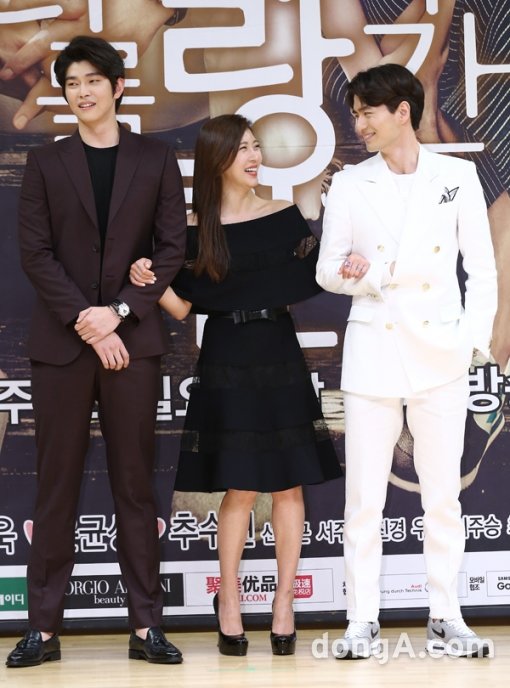 배우 윤균상(왼쪽부터), 하지원, 이진욱이 23일 오후 서울시 양천구 SBS사옥에서 열린 주말드라마 ‘너를 사랑한 시간’(이하 너사시) 제작발표회에서 포토타임을 하고 있다.