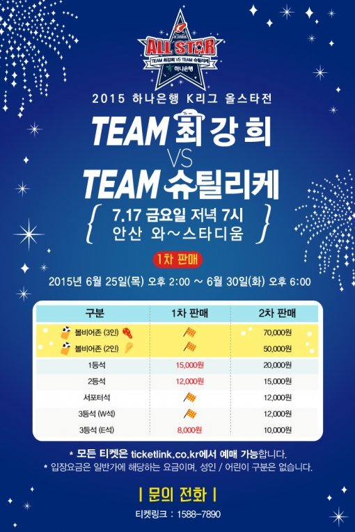 한국프로축구연맹(총재 권오갑)은 오는 25일 오후 2시부터 티켓링크(http://www.ticketlink.co.kr, 문의전화: 1588-7890)를 통해 ‘하나은행 K리그 올스타전’의 1차 티켓 판매를 시작한다.