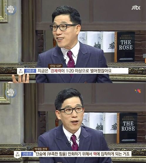 진중권은 “역으로 우리와 미국이 북한에 어떤 위협인가를 생각해본다면, 북한은 엄청난 위협을 느끼고 있다. 그래서 비대칭 전략이라고 해서 단숨에 부족한 힘을 만회하기 위해 핵에 집착하고 있다”고 밝혔다.