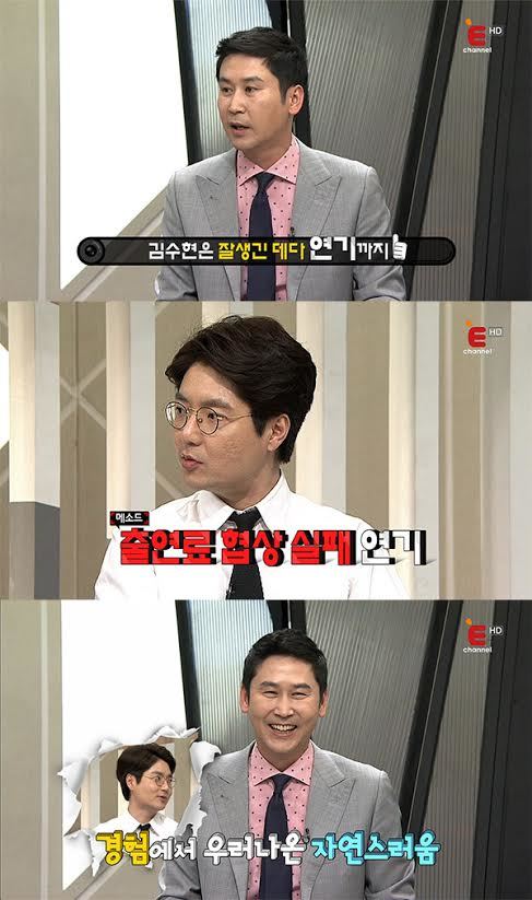24일 밤 11시에 방송하는 태광그룹 티캐스트 계열의 E채널 ‘용감한 기자들’ 117회 녹화 당시 한 패션뷰티 전문기자는 드라마 ‘프로듀사’의 PPL에 관한 취재담을 공개했다. 이를 듣던 패널 김정민이 신동엽에게 “드라마 ‘프로듀사’에서 카메오로 출연했는데 김수현에 대한 에피소드 없느냐”고 물었다.