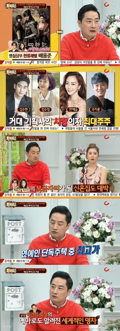 이어 강용석은 “배용준, 박수진 신혼집 자택도 시가가 95억이라더라. 연예인 단독주택 중 최고가다. 차는 이건희 회장도 탄다는 세계에서 가장 비싼 차다”라고 전해 놀라움을 자아냈다.