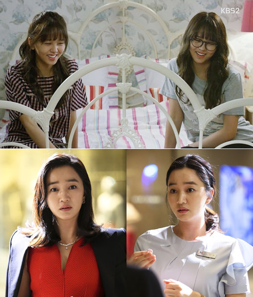 안방극장에 ‘1인2역’ 풍년이다. 지상파 방송3사가 나란히 1인2역을 주요 장치로 내세워 흥미를 돋우고 있다. 김소현이 KBS 2TV ‘후아유-학교2015’에서 쌍둥이를, 수애는(아래) SBS ‘가면’에서 도플갱어로 1인2역을 소화했다. 사진제공|KBS 화면 캡처·SBS