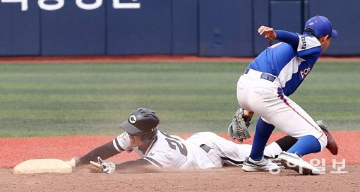 상원고 김민현(왼쪽)이 24일 목동구장에서 열린 제69회 황금사자기 전국고교야구대회 효천고전 9회초 2루수 양선빈의 태그에 앞서 간발의 차로 2루 도루에 성공하고 있다. 목동|전영한 동아일보 기자 coopjyh@donga.com