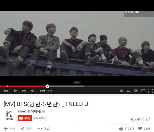 지난 4월 발매된 미니앨범 ‘화양연화 pt.1’의 타이틀곡인 ‘I NEED YOU’ 뮤직비디오는 28일 오후 5시를 기준으로 유튜브의 빅히트엔터테인먼트 채널에서 199만6794건, 1theK 채널에서 878만9157건으로 합계 1078만 5951건의 조회수를 기록했다.