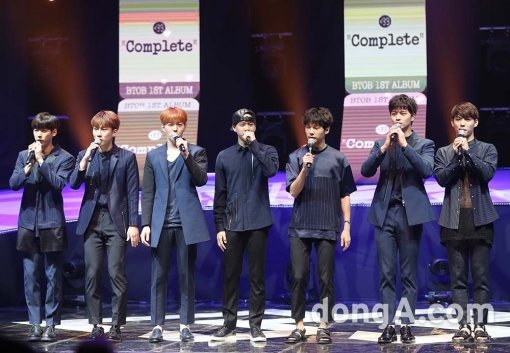 그룹 비투비(서은광, 이민혁, 이창섭, 임현식, 프니엘, 정일훈, 육성재)가 29일 상암동 DMS 제1스튜디오에서 열린 정규 1집 앨범 ‘컴플리트(Complete)’발매 기념 쇼케이스에서 인사말을 하고 있다.