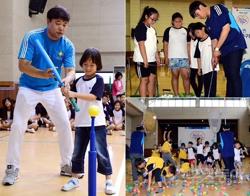 이날 프로그램의 하이라이트는 야구스타 양준혁의 야구 클리닉이었다. 거구의 양준혁이 성큼성큼 등장하자 아이들이 “우와! 테레비에 나온 아저씨다”며 함성을 지른다. 국민생활체육회의 홍보대사를 맡고 있는 양준혁은 아이들에게 티볼 캐치볼과 타격을 지도했다.