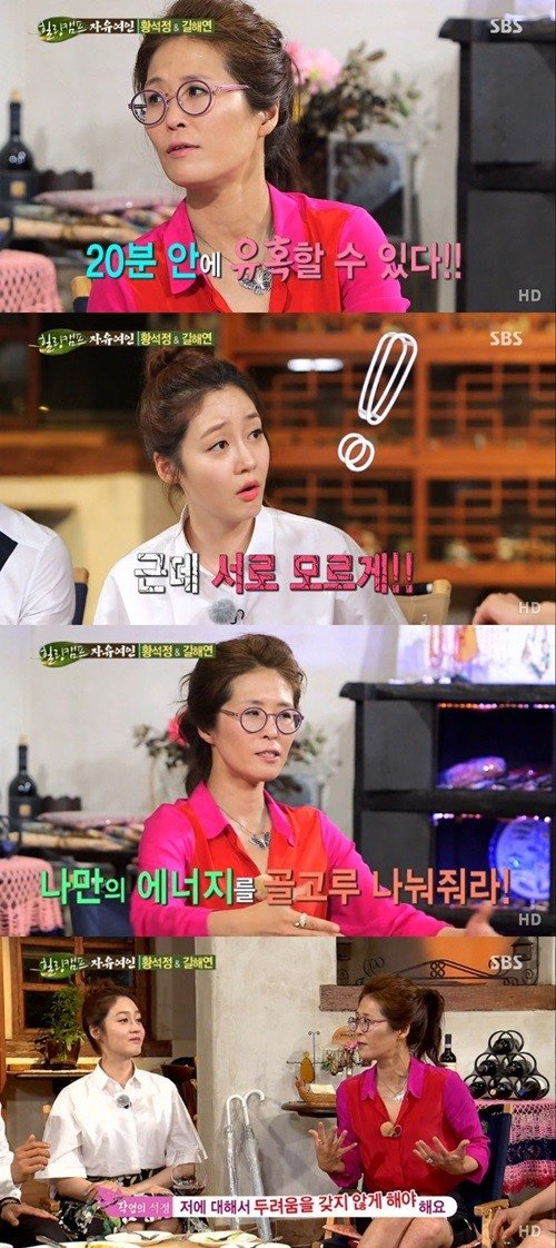 황석정은 작업 기술을 공개하며 “총 4가지 스텝이 있다”고 말해 눈길을 끌었다. 이 4가지는 자신만의 에너지를 찾는 것, 눈을 마주치는 것, 터치, 다른 남자 칭찬하기 등이었다.