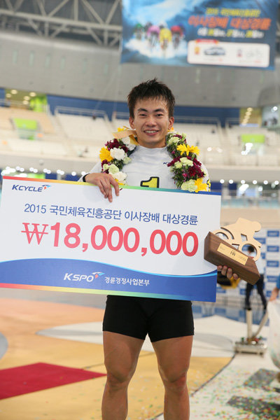 정종진이 지난 28일 열린 ‘2015 네티즌 선정 국민체육진흥공단 이사장배 대상 경륜’서 깜짝 우승을 한 뒤 상금 1800만원을 받아들고 활짝 웃고 있다. 사진제공|국민체육진흥공단 경륜경정사업본부