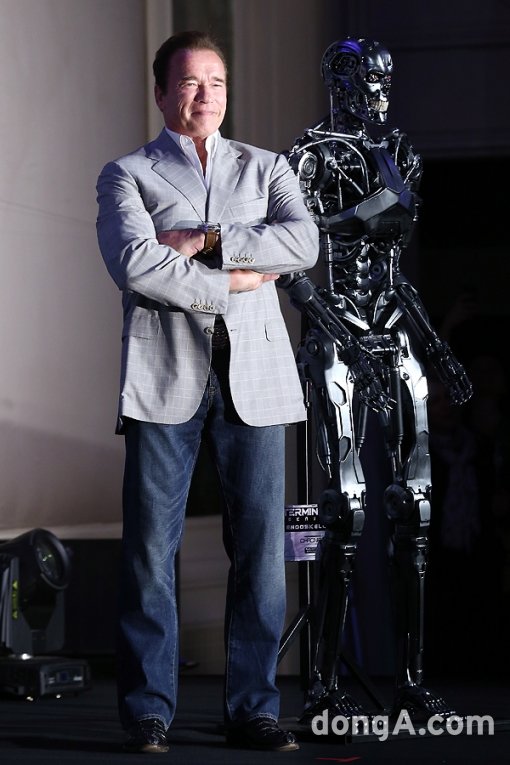 할리우드 스타 아놀드 슈왈제네거가 2일 오전 서울시 강남구 리츠칼튼호텔에서 열린 영화 ‘터미네이터 제니시스’ 의 내한 기자회견에 참석해 포토타임을 하고 있다.