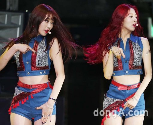 걸그룹 나인뮤지스의 경리와 민하가 2일 오후 서울 강남구 한 클럽에서 열린 새 미니앨범 '9MUSES S/S EDITION ‘ 쇼케이스에서 라이브 무대를 선보이고 있다.