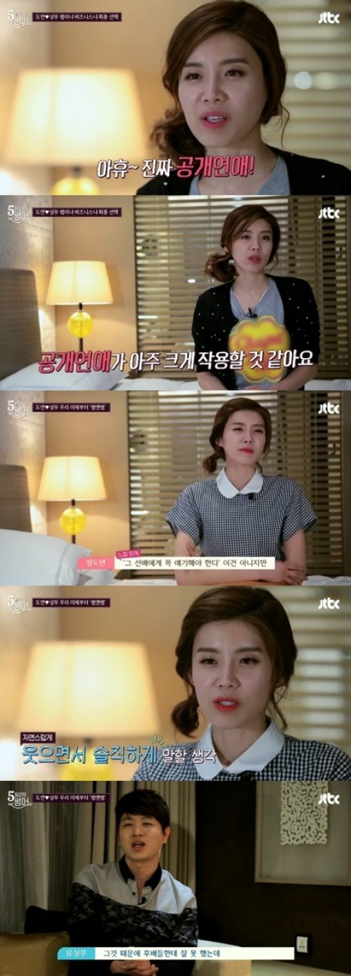 유상무 장도연이 '썸'을 선택하기까지 최대 걸림돌은 유상무의 공개연애 경험이었다. 장도연은 "아휴 진짜 공개연애. 하다못해 법적으로 갔다오신 분들도 죄는 아니지 않나. 관계가 있다는 거다. (유상무의) 공개연애를 가까이서 봤던 사람인데 그걸 배제하기가 어렵다. 그 부분이 아주 크게 작용할 것 같다"며 우려를 표했다.