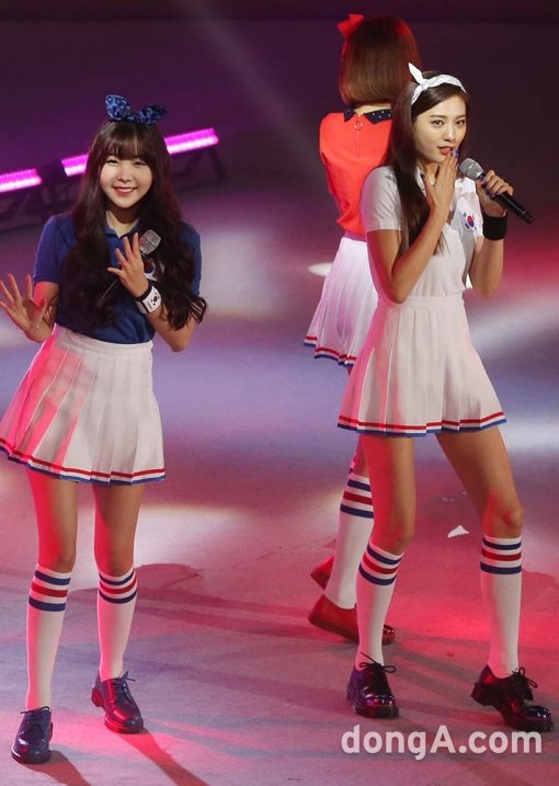 걸그룹 오렌지카라멜이 3일 오후 경기 고양 덕양구 어울림누리 아이스링크에서 열린 국민대합창 ‘나는 대한민국’에서 카탈레나 무대를 선보이고 있다.