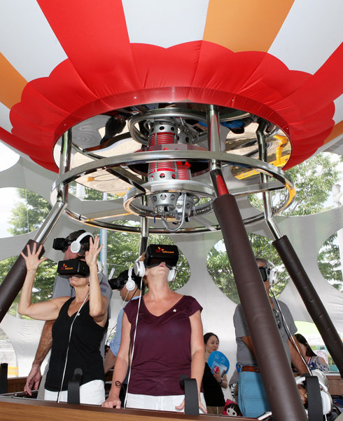 광주월드컵경기장 북문에 위치한 첨단 ICT 체험관 ‘티움 모바일’에서 외국인 관람객들이 열기구에서 앞으로 다가올 첨단 서비스를 가상현실(VR)을 통해 체험하고 있다. 사진제공|SK텔레콤