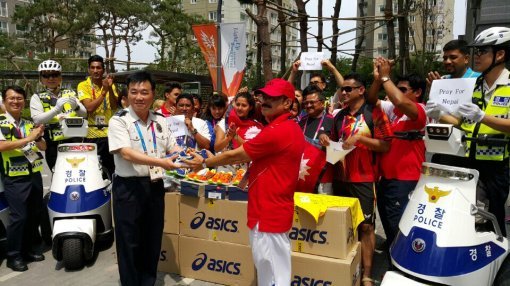 선수촌 경찰서비스센터장 김명선 경감은 5일 오후 2시경 네팔선수단 숙소를 방문, 선수단장(Pradeep Joshi) 등 30명의 선수들에게 선수들이 사용할 운동화 등 170만원 상당의 위문품을 전달했다.