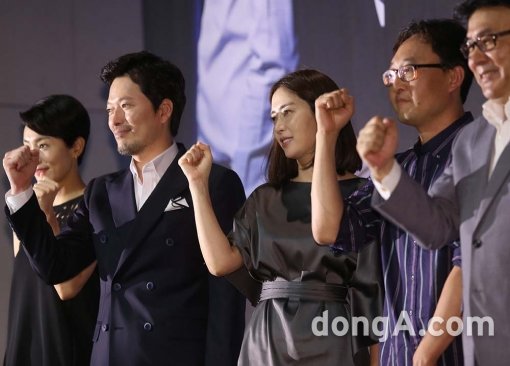 배우 김서형, 정재영, 송윤아, 감독 황인혁, 박영규(왼쪽부터)가 9일 오후 서울 장충동 그랜드 앰배서더호텔에서 열린 KBS2 TV드라마 어셈블리 제작발표회에 참석해 파이팅 포즈를 취하고 있다.