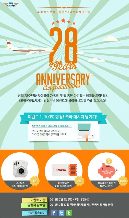 16일부터 시작하는 2차 이벤트에서는 투어 익스프레스를 통해 항공권을 구매하면 추첨을 통해 다양한 혜택을 제공한다. 3차 이벤트는 7월과 8월에 생일을 맞은 고객을 대상으로 8월 6일부터 진행한다. 창립 28주년 기념 이벤트는 투어익스프레스 홈페이지에서 확인 및 참여가 가능하다.