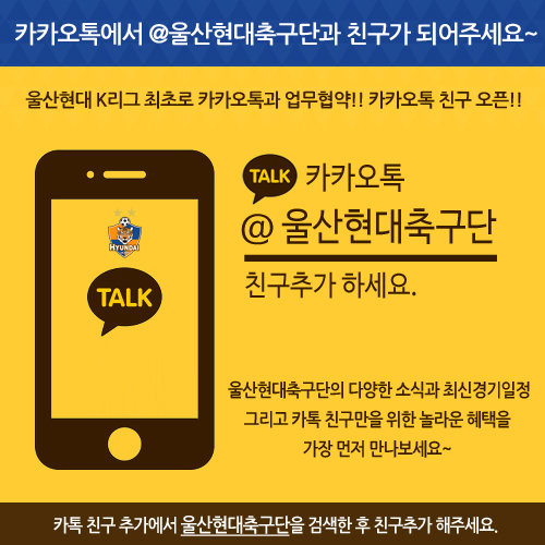 ‘울산현대 카카오톡 친구’는 카카오톡 앱에서 울산현대축구단을 검색하거나 혹은 http://goto.kakao.com/iboiouus 로 접속 후 친구추가를 하면 된다.