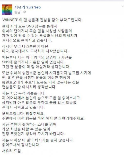 서유리는 13일 자신의 페이스북을 통해 "'WINNER' 의 팬 분들께 진심을 담아 부탁드립니다"라는 글을 게재했다.
