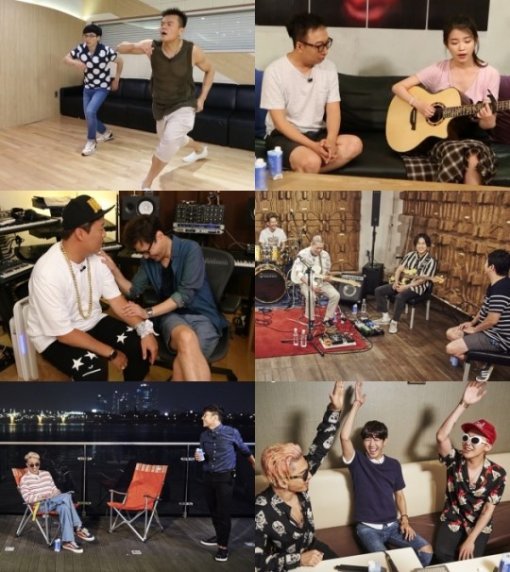 또 다른 사진엔 유재석·박진영, 박명수·아이유, 정준하·윤상, 정형돈·혁오, 하하·자이언티의 모습이 담겨 있다. 특히 유재석은 박진영의 연습실에서 댄스 삼매경에 빠져 있는 듯해 웃음을 자아낸다.