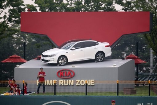 광주-기아 챔피언스 필드 외야 우중간 잔디석에 설치된 ‘KIA 홈런존’에는 구조물 위에 기아자동차 차량 1대가 전시되며, 홈런으로 차량이나 구조물을 직접 맞히는 선수에게 해당 차량을 증정하고 있다.