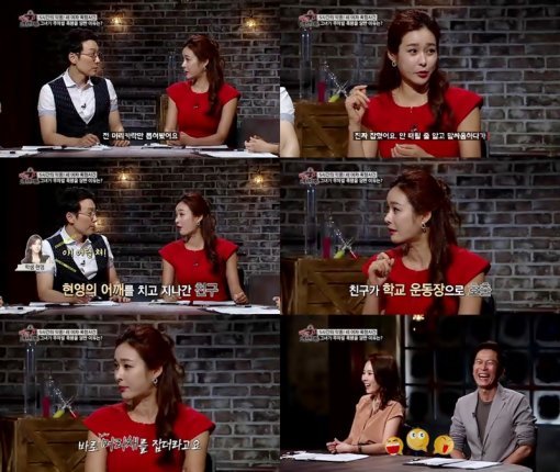 그는 “맞아본 적 있느냐”는 이휘재의 돌발 질문에 “머리카락만 뽑혀봤다”고 대답했다. 이후 현영은 “학창시절 교실에서 자신의 어깨를 치고 간 친구에게 “야! 어딜 쳐!”라고 시비를 건 것이 화근이었다”고 회상했다.