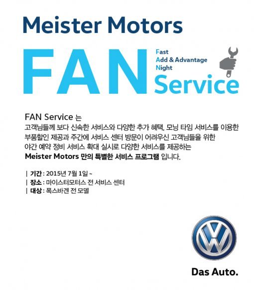 폭스바겐 공식딜러 마이스터모터스(대표: 이기준)는 1일부터 마이스터모터스 서비스센터를 방문하는 폭스바겐 고객을 대상으로 팬서비스(FAN Service) 프로그램을 제공하고 있다.
