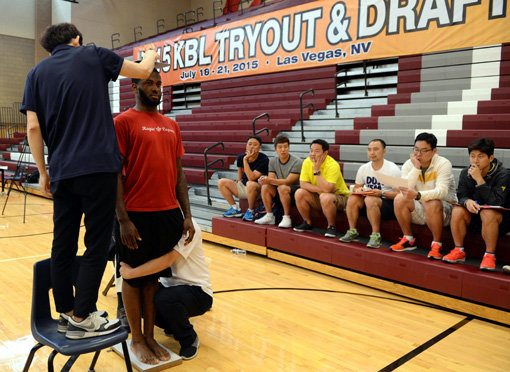 KBL이 19일(한국시간) 미국 라스베이거스의 한 고등학교에서 열린 2015∼2016시즌 외국인선수 드래프트에서 트라이아웃에 참가한 외국인선수의 키를 측정하고 있다. 라스베이거스(미 네바다주)|KBL사진공동취재단