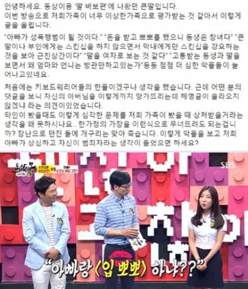큰 딸은 18일 자신의 페이스북을 통해 “이번 방송으로 저희 가족이 너무 이상한 가족으로 평가받는 것 같아 이렇게 글을 올린다. ‘아빠가 성폭행범이 될 것이다’, ‘돈을 받고 뽀뽀를 했으니 동생은 창녀다’ 등 심한 악플이 늘어나고 있다”라고 말했다.