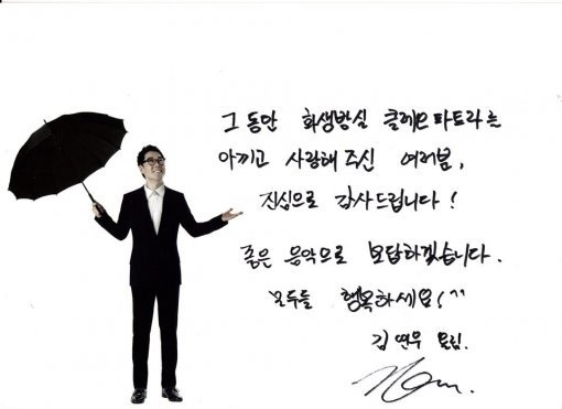 김연우는 소속사 미스틱89의 공식 SNS를 통해 활짝 웃고 있는 사진과 함께 “그동안 화생방실 클레오파트라를 아끼고 사랑해주신 여러분, 진심으로 감사합니다. 좋은 음악으로 보답하겠습니다. 모두들 행복하세요!^^” 라고 전했다.