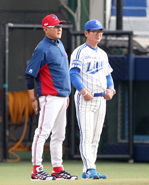 KIA 김기태 감독(왼쪽)과 삼성 류중일 감독이 21일 대구구장에서 후반기 첫 경기를 치르기에 앞서 잠시 만나 대화한 뒤 선수들의 훈련 장면을 지켜보고 있다. 사진제공|스포츠코리아