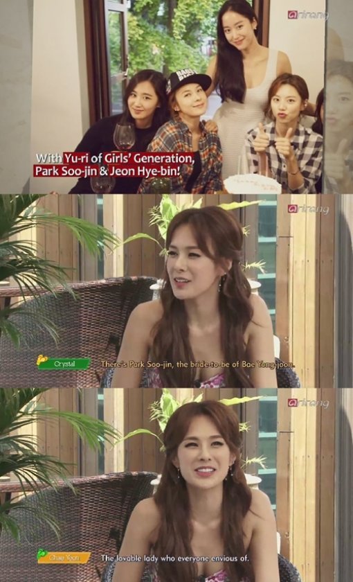 가수 채연은 22일 방송된 아리랑TV ‘쇼비즈 코리아’에서 절친 박수진을 언급했다. 이날 방송에서 MC들은 채연이 박수진, 전혜빈, 소녀시대 유리와 함께 찍은 사진을 소개했다.