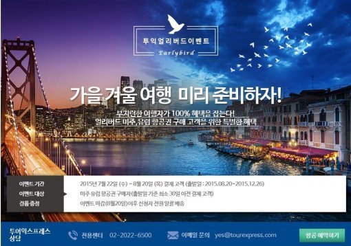 투어 익스프레스 홈페이지에서 미주와 유럽행 얼리버드 항공권을 30일 이전(출발일기준)에 구매한 고객에게 아이스 아메리카노, 60일 이전에 구매한 고객에게는 서울역-인천공항 공항철도 직통열차 편도 2매, 90일 이전에 구매한 고객에게는 신라면세점 5만원 선불카드 교환권을 증정한다. 이벤트 기간은 8월 20일까지며(8월 20일부터 12월 26일까지 출발기준), 출발일을 기준으로 최소 30일 이전에 결제한 미주·유럽 얼리버드 항공권 구매자를 대상으로 한다.