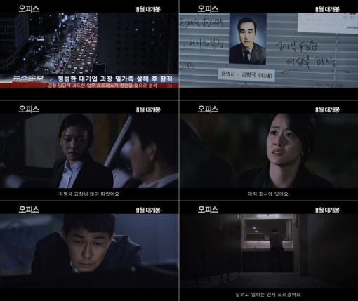 이후 “일가족을 살해한 그가 다시 출근했다!”라는 섬뜩하고 강렬한 카피와 함께 인턴 ‘이미례’(고아성)에게 메신저로 말을 거는 ‘김병국 과장’, 사무실에서 발견되는 의문의 시신, ‘김병국 과장’을 둘러싼 동료들간의 심상치 않은 관계를 암시하는 장면들이 연이어 등장해 ‘오피스’가 선사할 예측불허 스토리와 충격적인 반전에 대한 관객들의 궁금증을 증폭시키고 있다.