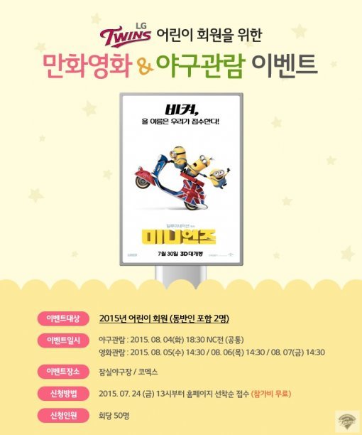 LG는 오는 8월 4일 오후 6시30분부터 잠실구장에서 열리는 NC다이노스와의 홈경기에 어린이회원과 보호자 300명을 초청하고, 삼성동 코엑스 메가박스에서 애니메이션 영화 <미니언즈>를 볼 수 있는 영화관람 티켓을 제공한다. 영화관람은 8월 5일부터 7일까지 3일간 진행된다.