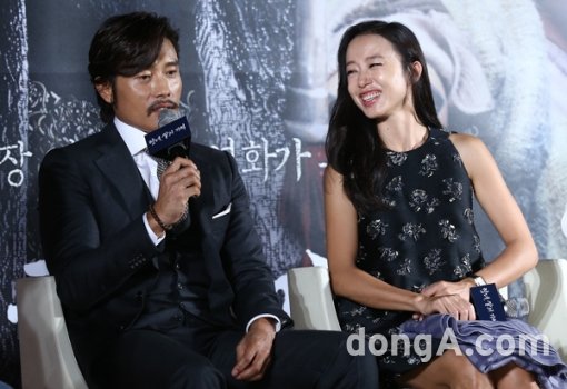 배우 이병헌(왼쪽부터), 전도연이 24일 오전 서울 광진구 자양동 롯데시네마 건대입구점에서 진행된 영화 '협녀, 칼의 기억' 제작보고회에 참석해 기자간담회를 하고 있다.