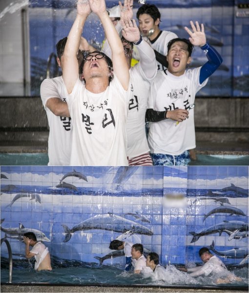 이와 함께 또 다른 스틸에는 마치 돌고래가 된 듯한 멤버들이 벽면에 그려진 수많은 돌고래 떼와 함께 어우러져 수영을 즐기고 있어 눈길을 사로잡는다. 이들은 김준호를 필두로 제주도 남방돌고래 떼와 완벽한 싱크로율을 자랑하는 접영 실력을 뽐내 모두의 이목을 집중시켰다는 후문이다.