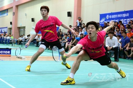 삼성전기 이용대(오른쪽)-김기정이 26일 춘천 봄내체육관에서 열린 제58회 전국여름철종별배드민턴선수권대회 12일째 남자 일반부 단체전 결승 4경기(복식)에서 MG새마을금고 강지욱-이상준의 공격을 막아내고 있다. 춘천|김민성 기자 marineboy@donga.com