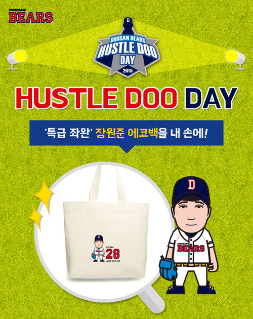 29일(수) 실시하는 '허슬두데이'의 주인공은 '특급 좌완 에이스' 장원준이다. 이날 두산베어스는 특정 관중석(레드석 103~104 블럭)을 '허슬두데이존'으로 편성, 이 좌석을 이용하는 팬들에게 장원준의 캐리커처가 프린트되어 있는 에코백을 증정하고, 장원준 선수에게 직접 응원 메시지를 보내는 전광판 라이브 이벤트에 참여할 수 있는 기회도 함께 제공한다.