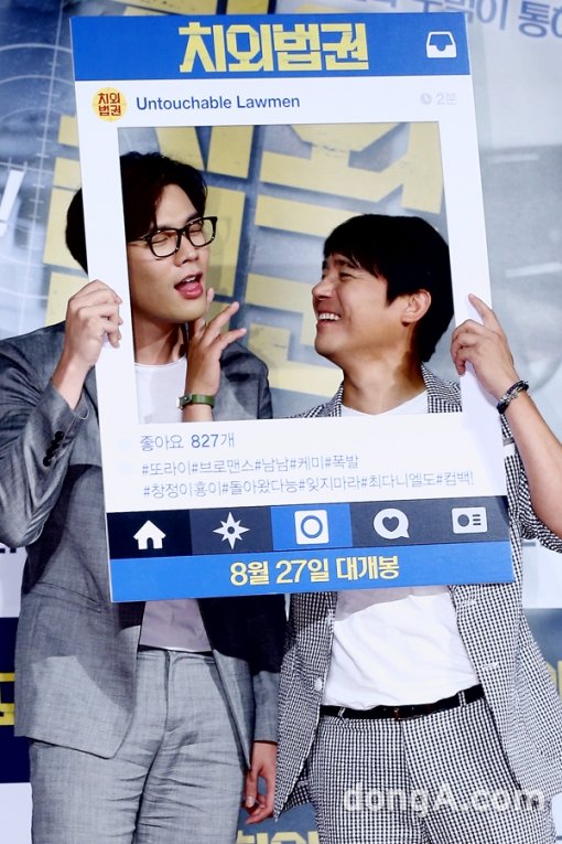 배우 최다니엘(왼쪽), 임창정이 27일 오전 서울시 광진구 건대입구 롯데시네마에서 열린 영화 ‘치외법권’ 제작발표회에 참석해 포토타임을 하고 있다.