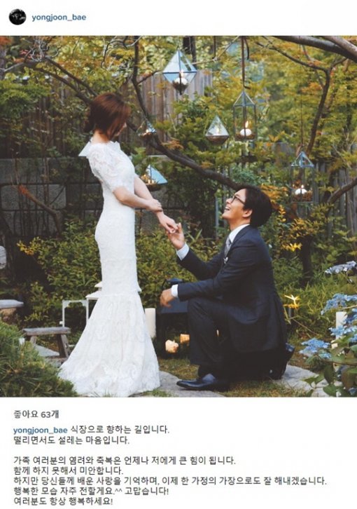 27일 배용준은 자신의 인스타그램에 “식장으로 향하는 길입니다. 떨리면서도 설레는 마음입니다. 가족 여러분의 염려와 축복은 언제나 저에게 큰 힘이 됩니다. 함께 하지 못해서 미안합니다. 하지만 당신들께 배운 사랑을 기억하며, 이제 한 가정의 가장으로도 잘 해내겠습니다. 행복한 모습 자주 전할게요. 고맙습니다! 여러분도 항상 행복하세요!”라는 글로 결혼소감을 전했다.