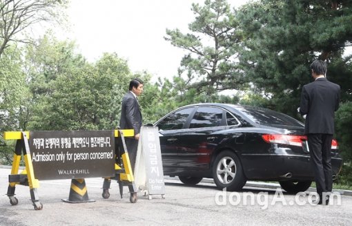 배우 배용준과 박수진의 결혼식이 열리는 27일 오후 서울시 광진구 광장동 쉐라톤 그랜드 워커힐 애스톤하우스 앞 경호원들이 출입을 통제하고 있다.