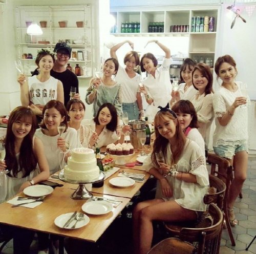 공개된 사진 속에는 박수진과 배용준의 결혼을 축하기 위해 함께 모여 브라이덜 샤워를 즐기고 있는 소녀시대 유리, 이연두, 왕지혜, 김성은, 신지수, 채연, 육혜승, 황정음 등의 모습이 담겼다.