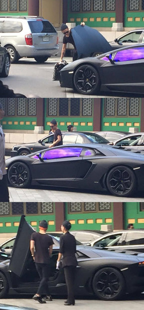 사진 속 지드래곤은 서울 신라 장충동 신라호텔에서 자신의 차 람보르기니를 세워놓고 이를 살펴보고 있는 모습이다.