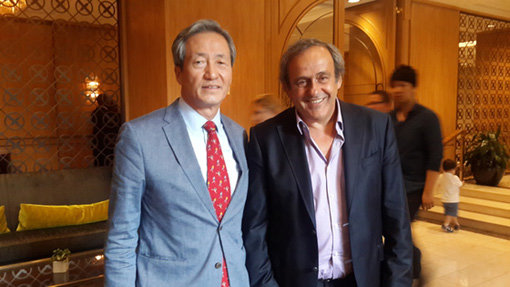 정 명예회장은 27일 자신의 홈페이지를 통해 하루 전 2015 북중미 골드컵이 펼쳐지고 있는 미국 필라델피아에서 플라티니 회장을 만나 이같이 제안했다고 밝혔다. 또 8월 중 유럽에서 다시 만나기로 했다고 덧붙였다. 정 회장은 8월 유럽에서 출마를 공식 선언할 계획이다.