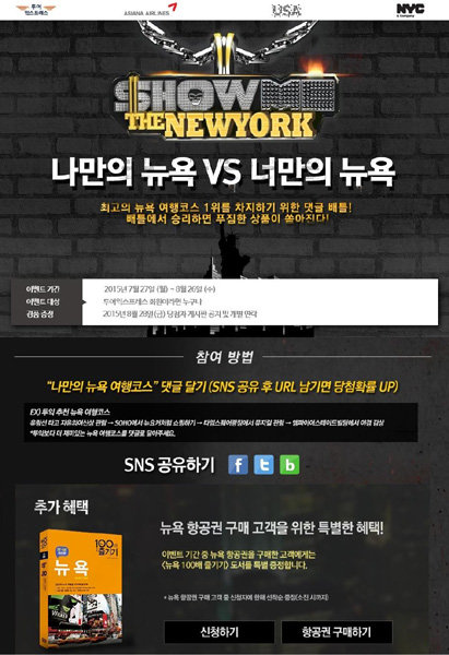 투어익스프레스 홈페이지 회원이면 누구나 참여할 수 있는 ‘쇼 미 더 뉴욕’는 자유 배낭여행객들이 가장 선호하는 도시 뉴욕을 주제로 자신만 알고 있는 숨은 여행코스를 소개하는 이벤트다. 참가자의 배틀 형식으로 진행하며 이벤트 기간은 27일부터 8월 26일까지다. 자신의 SNS를 통해 공유하게 되면 당첨확률이 높아진다. 8월 28일 추첨을 통해 1등 10명에게 치킨을, 2등 10명에게는 뉴욕치즈 케이크를 제공한다. 이벤트 기간 중 투어익스프레스를 통해 뉴욕행 항공권을 구입하면 여행 안내서 ‘뉴욕 100배 즐기기’를 선착순 증정한다