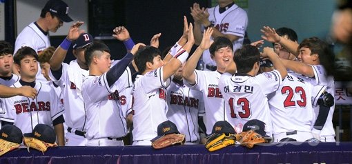 두산 정진호(23번)가 29일 잠실 한화전에서 0-1로 뒤진 5회말 2사 후 배영수를 상대로 1-1 동점 우월솔로홈런을 터트리고 덕아웃으로 돌아와 동료들의 축하인사를 받고 있다. 잠실|김종원 기자 won@donga.com