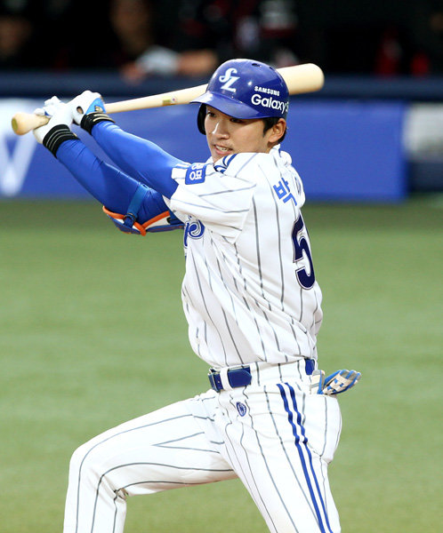 29일 대구구장. 무더위 속에서 타격훈련을 시작한 NC 박민우(23)를 향해 삼성 박해민(25·사진)이 달려갔다. 둘은 지난해 팀의 주축으로 자리 잡으면서 신인왕을 다퉜던 사이. 게다가 올해는 도루왕을 놓고 치열한 경쟁을 펼치고 있다. 이날 경기 전까지 도루 33개로 1위에 올라있던 박민우를 3위 박해민(31개)이 맹렬히 뒤쫓고 있는 형국이었다.